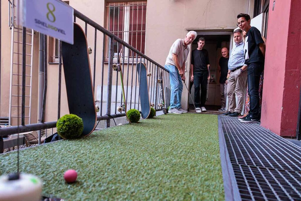 Wir verwandeln Büros, Flure und Eventlocations in einen Golfplatz – mit kompletter Ausrüstung, Parcours-Design und auf Wunsch professioneller Turnierleitung. So entsteht ein lockeres Teamevent, das Menschen ins Gespräch bringt.